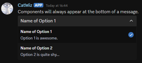 <figure><img src="https://1776429820-files.gitbook.io/~/files/v0/b/gitbook-x-prod.appspot.com/o/spaces%2Fd6SxgQmtmSr2YrbDKvwZ%2Fuploads%2Fgq9M1Azio78Q0riqUSxo%2Fimage.png?alt=media&#x26;token=1fdbbe60-c3af-457c-9db9-8c29eb412f4a" alt=""><figcaption><p>A string select menu with two simple options to choose from.</p></figcaption></figure>