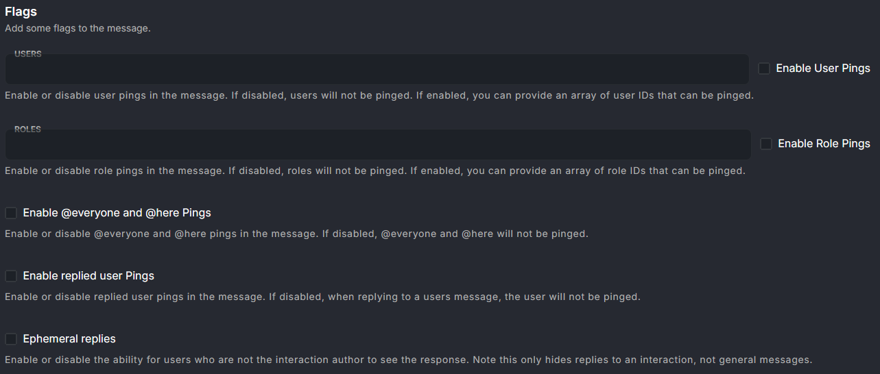 Flags are simply a list of settings for your message, such as enabling whether you want the message's replies to be hidden. Or, toggling the pings on the message, to avoid accidental pings. Below is an example of the flags page, and all of the options you can modify.
