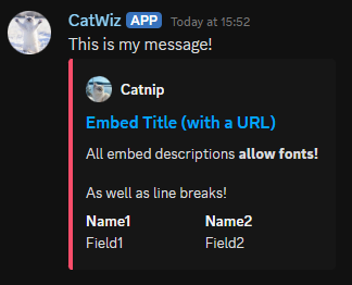 <figure><img src="https://1776429820-files.gitbook.io/~/files/v0/b/gitbook-x-prod.appspot.com/o/spaces%2Fd6SxgQmtmSr2YrbDKvwZ%2Fuploads%2FdIcrMsLvSrFhCZeXkPyL%2Fimage.png?alt=media&#x26;token=edbd089c-cbe6-48fb-838b-88f4a8001be4" alt=""><figcaption><p>A message sent with content and an embed with author properties.</p></figcaption></figure>