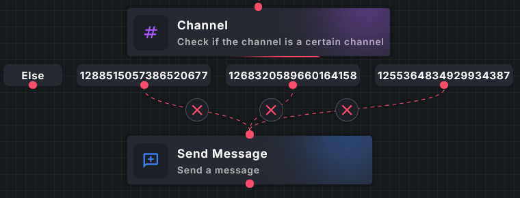 If I wanted a staff-only command, I can use a channel condition. In the following example, I have added my staff channel IDs and connected a send message block. If the command was not run in a staff channel, a message will not be sent as no blocks are attached to my else condition.