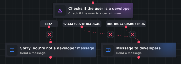 User conditions allow you to check if the interacting user is someone specific. This can be useful for developer-only commands, whereby you check to see if the command executor is a developer. To set up a user condition, just enter the user IDs you wish to perform unique actions with.