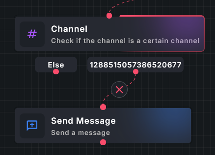 A channel condition allows you to run specific actions depending on the current channel (e.g., the channel the command was run in). If the current channel does not match any of your conditions, the 'else' condition will trigger.