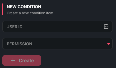 <figure><img src="https://1776429820-files.gitbook.io/~/files/v0/b/gitbook-x-prod.appspot.com/o/spaces%2Fd6SxgQmtmSr2YrbDKvwZ%2Fuploads%2FdTIL6owbwGoSBpTBkcxK%2Fimage.png?alt=media&#x26;token=24c6ada6-6d1b-42f7-81de-fc013d4656ae" alt=""><figcaption><p>This is what you must enter per condition you create on a permissions condition block.</p></figcaption></figure>
